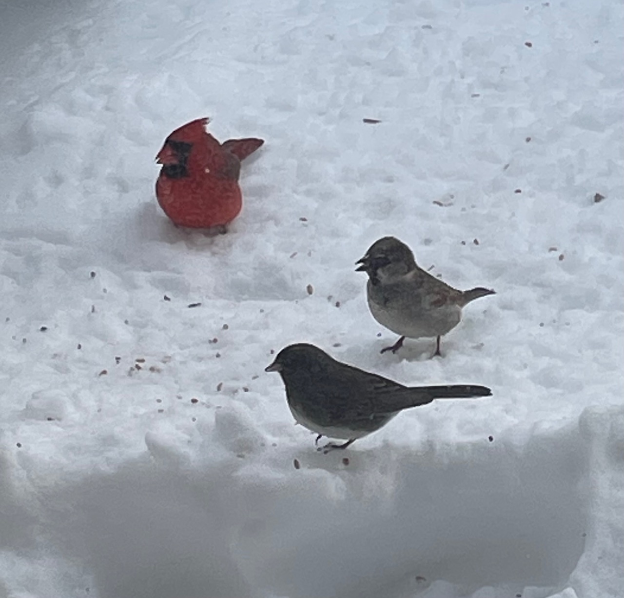 During the recent Arctic blast/snowmaggedon, I noticed bird tracks in the snow on the deck. Dutifully, I threw out birdseed. A menagerie of feathered friends visited, such as the three you see here.